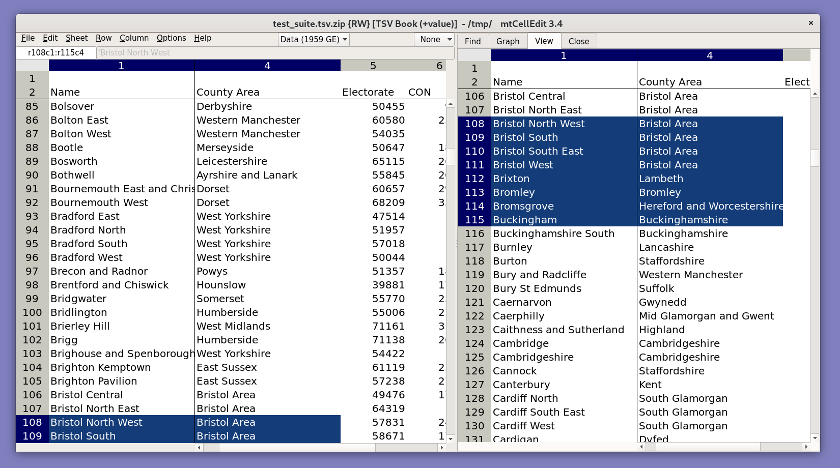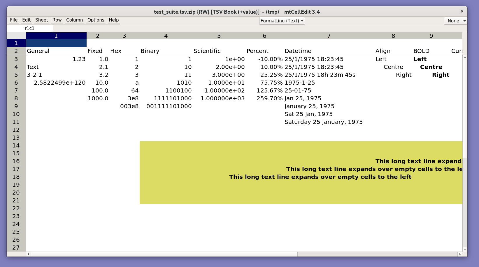 The default file format mtCellEdit uses is portable and transparent as it is a ZIP file containing TSV text files. I deliberately designed it this way so that data can be extracted and read by any modern spreadsheet program on any operating system without requiring mtCellEdit. Over the years I have been frustrated by binary and XML formats that make data only accessible via a single program (or by me wasting time manually converting each file, or by me writing a file format conversion program). This format ensures that my data never becomes stranded, and can be manipulated by whichever tool I choose for a particular job (i.e. spreadsheet programs, text editors, command line tools, etc).